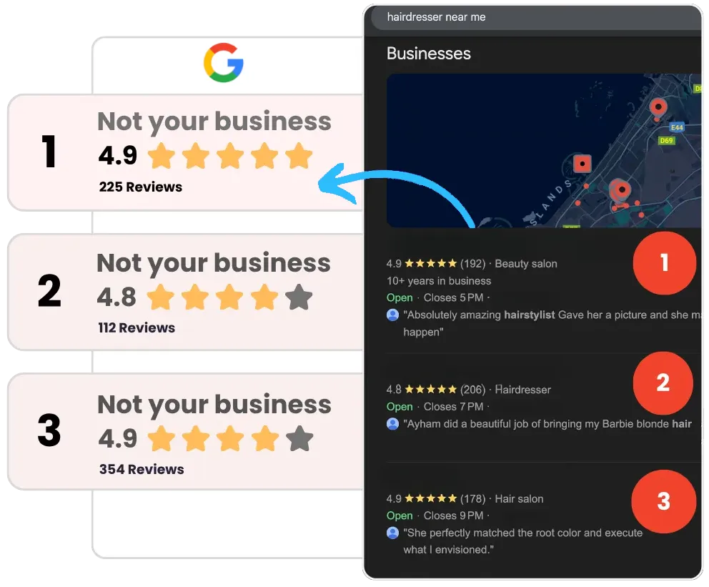 You outperform competitors, but fewer reviews mean Google shows them first — costing you valuable business opportunities.
